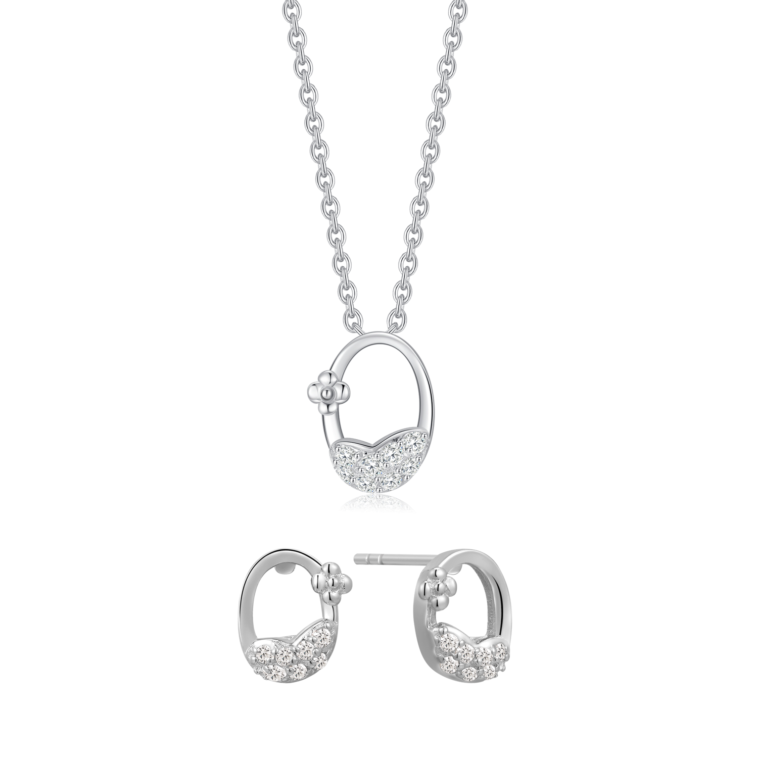 Et elegant sølvsæt i rhodineret sølv, designet med en smuk oval form og indfattet med funklende syntetiske cubic zirconia-sten langs kanten. Rhodineringen giver et skinnende, slidstærkt finish, som bevarer glansen over tid. Sættet består af både kæde og vedhæng, perfekt til både hverdag og festlige anledninger. Et tidløst smykke, der udstråler klassisk skønhed og raffinement.