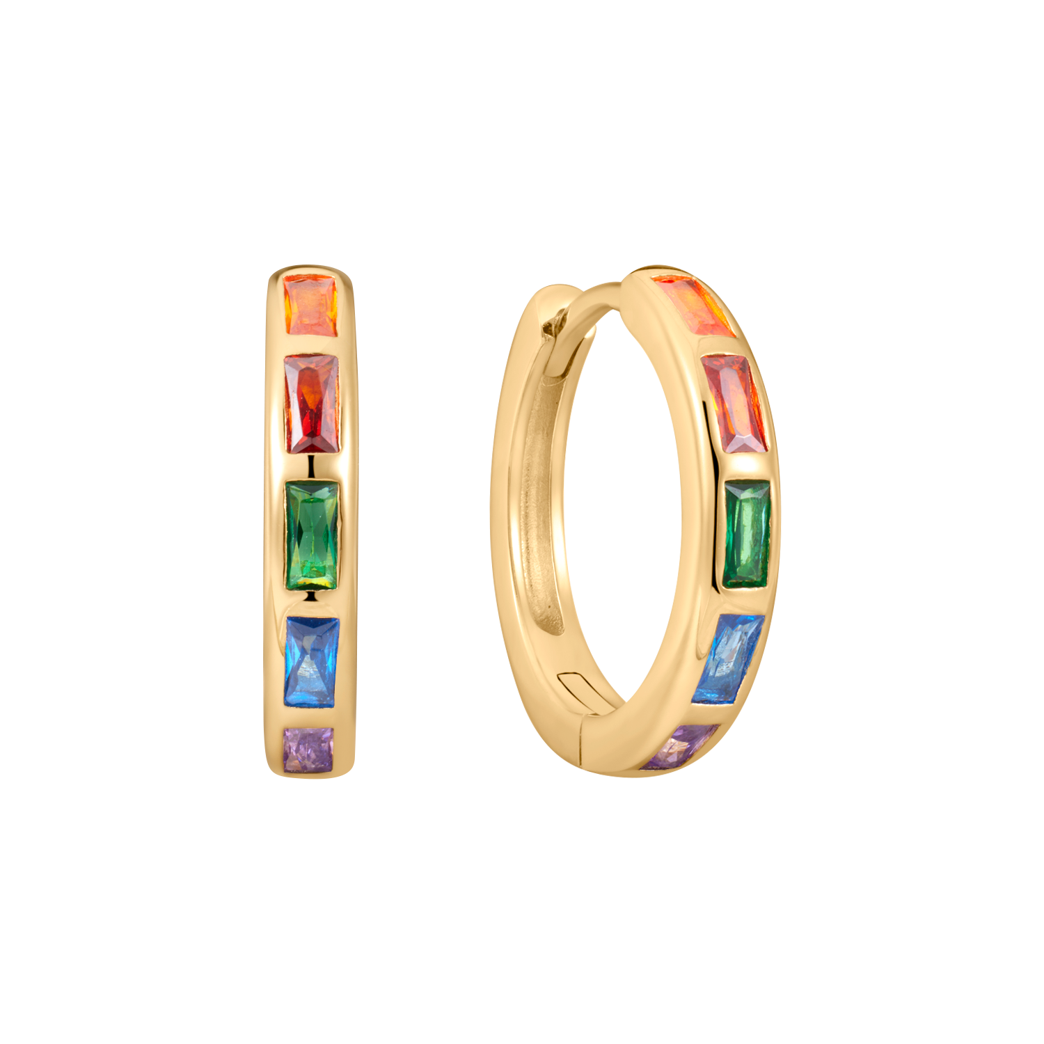 Disse elegante sølvforgyldte creoler kombinerer klassisk form med moderne glans. De er designet som knækcreoler, hvilket gør dem nemme at tage af og på, og er udsmykket med farvede syntetiske cubic zirconia, der giver et levende og eksklusivt udtryk. Den varme guldtone fremhæver stenens farver smukt og gør øreringene ideelle til både hverdag og festlige lejligheder.