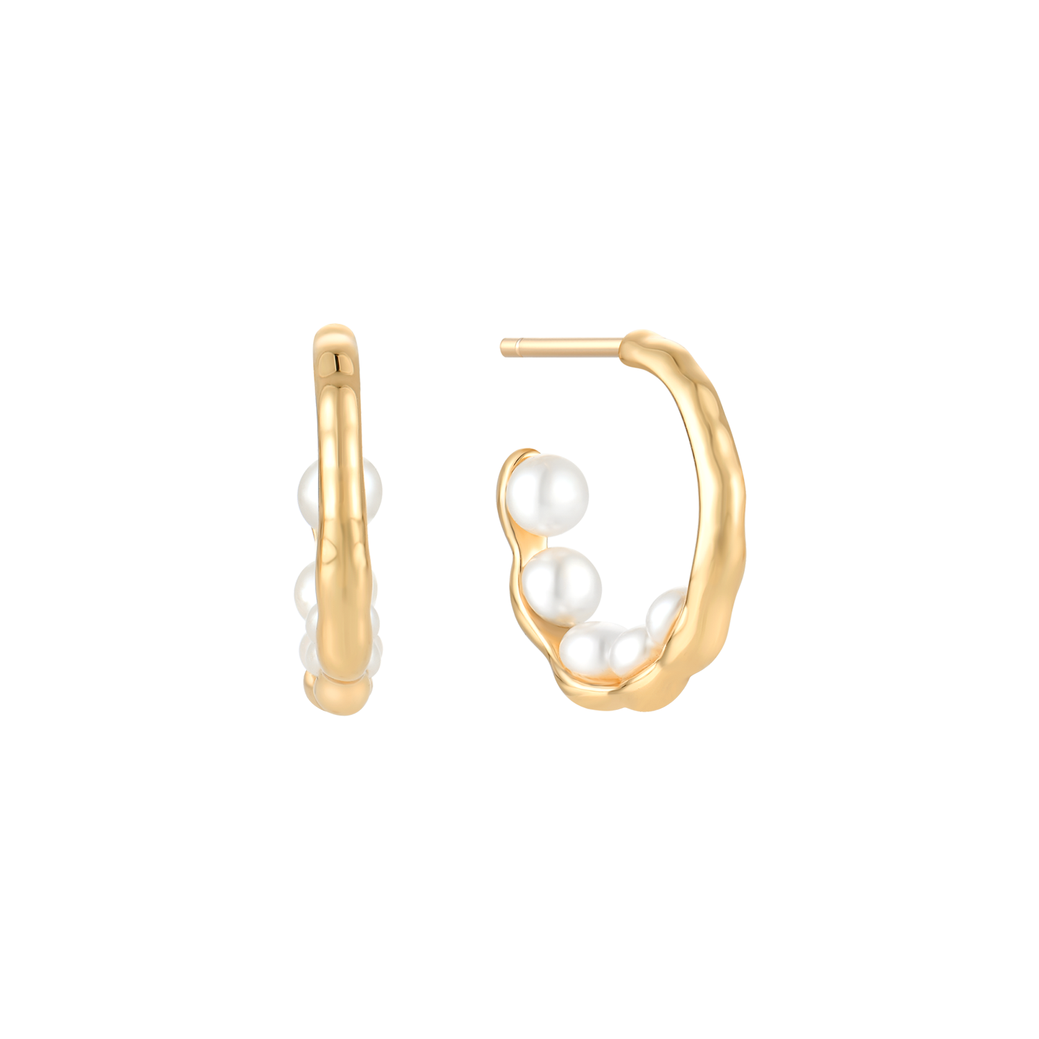 Elegante sølvforgyldte creoler med et unikt, takket design langs kanten, der giver et moderne og raffineret udtryk. Øreringene er smukt udsmykket med fem glansfulde ferskvandsperler, som tilfører et klassisk og feminint præg. Kombinationen af den varme guldtone og de naturlige perler skaber et harmonisk og stilfuldt look, perfekt til både hverdag og festlige lejligheder.