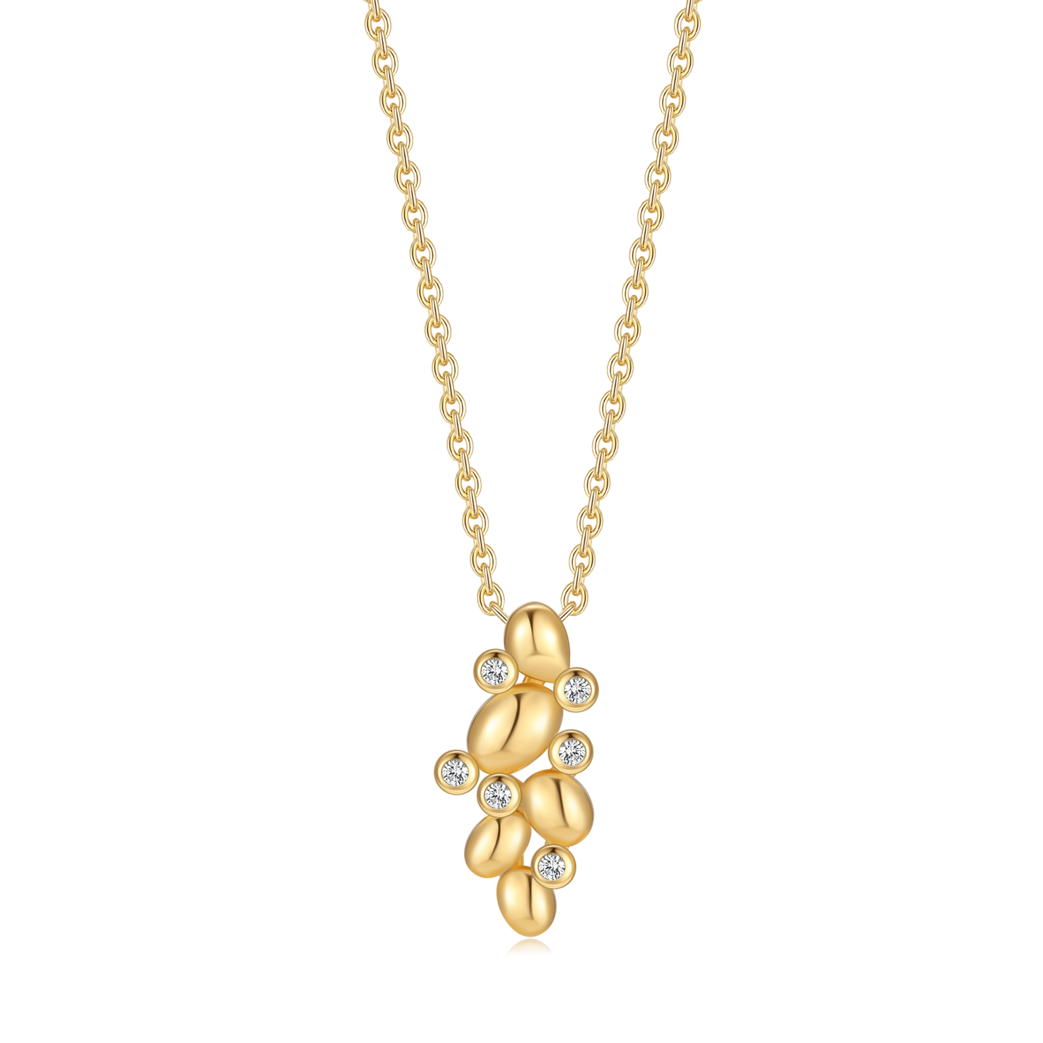 Eksklusiv sølvforgyldt halskæde med fem ovale led i forskellige størrelser, smukt prydet med seks funklende syntetiske cubic zirconia. Smykket udstråler elegance og raffinement med sit moderne, men tidløse design. Halskæden er forgyldt med ægte sølv og har en justerbar længde, så den passer perfekt til enhver stil. Et glimrende valg til både hverdag og festlige anledninger.