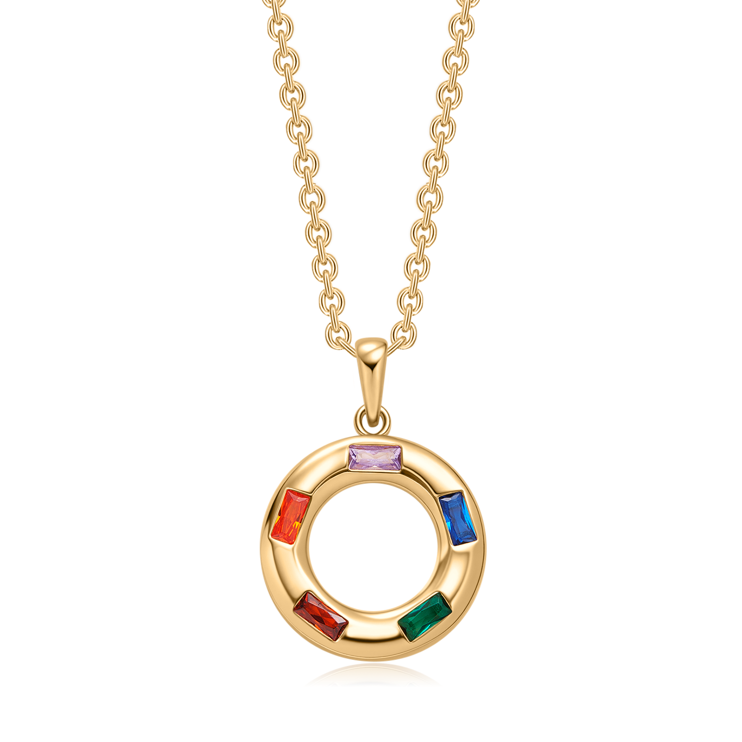 En strålende sølvforgyldt halskæde med et smukt cirkelformet vedhæng, prydet med farvede syntetiske cubic zirconia-sten. De levende farver giver smykket et moderne og elegant udtryk, mens den sølvforgyldte overflade tilføjer en varm og eksklusiv glans. En stilfuld halskæde, der tilføjer et farverigt touch til både hverdags- og festtøj.