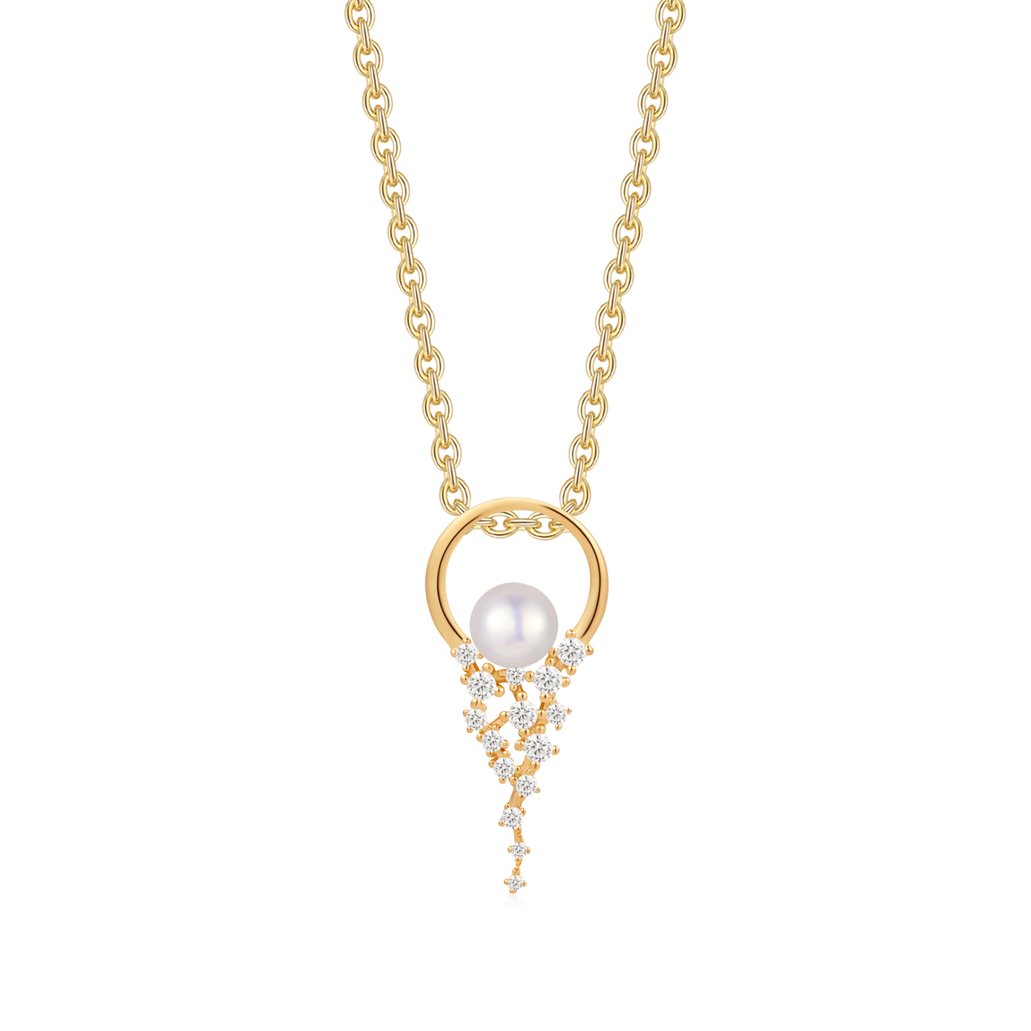 En eksklusiv sølvforgyldt halskæde med et elegant cirkelformet vedhæng dekoreret med små dråber og funklende syntetiske cubic zirconia. I midten sidder en smuk ferskvandsperle, der giver smykket et klassisk og feminint udtryk. Kombinationen af guldtoner, glitrende sten og perle skaber et harmonisk design, perfekt til både hverdag og fest.
