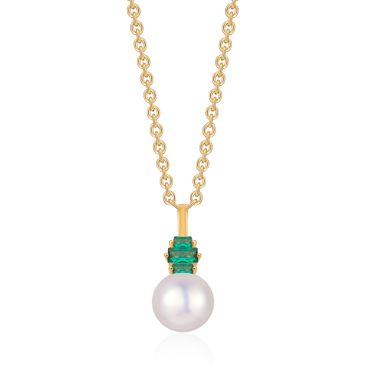 En elegant sølvforgyldt halskæde med tre smukke syntetiske smaragder og en glansfuld ferskvandsperle. Kombinationen af de grønne sten og den hvide perle skaber et harmonisk og luksuriøst udtryk. Det feminine design og den varme forgyldning gør smykket ideelt til både daglig brug og festlige lejligheder, hvor det tilfører et eksklusivt touch.