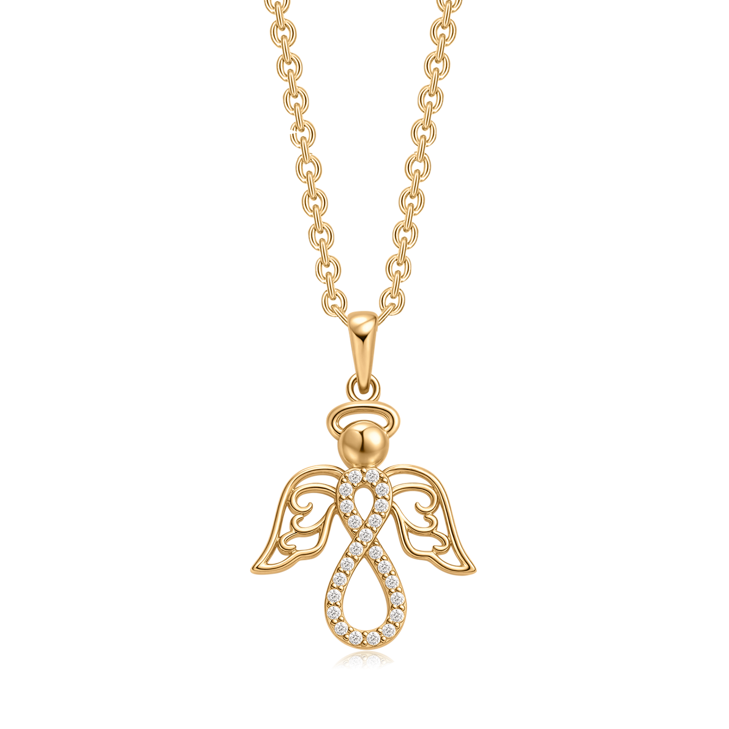 Denne elegante sølvforgyldte halskæde har et smukt engledesign, prydet med syntetiske cubic zirconia for ekstra glans og sofistikation. Englen symboliserer beskyttelse og kærlighed, hvilket gør halskæden til et betydningsfuldt smykke, der er perfekt til både hverdag og særlige anledninger.