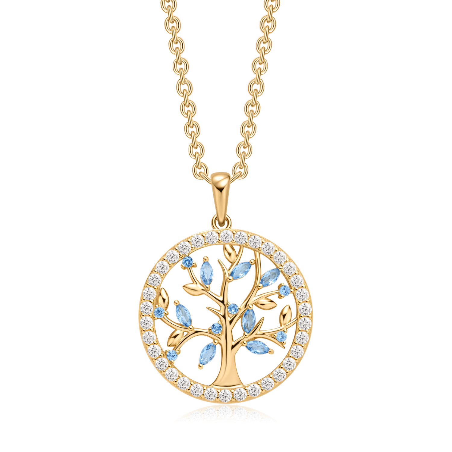 Denne smukke sølvforgyldte halskæde har Livets Træ designet i en cirkel, prydet med blå syntetiske cubic zirconia, som giver et elegant og farverigt udtryk. Livets Træ symboliserer vækst, styrke og forbundethed, hvilket gør halskæden både meningsfuld og smuk.