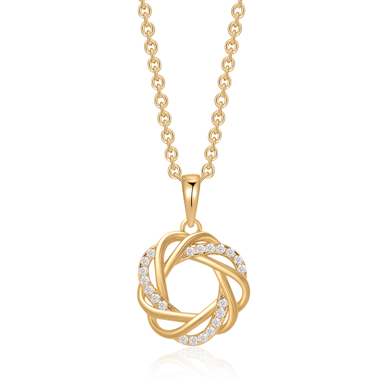 Elegant sølvforgyldt halskæde med et flettet cirkeldesign, prydet med syntetiske cubic zirconia for et funklende og moderne udtryk. Den rhodinerede sølvkæde giver halskæden et holdbart og skinnende look, der forbliver flot i lang tid. Denne halskæde tilføjer et sofistikeret touch til både hverdagens og festens outfits.