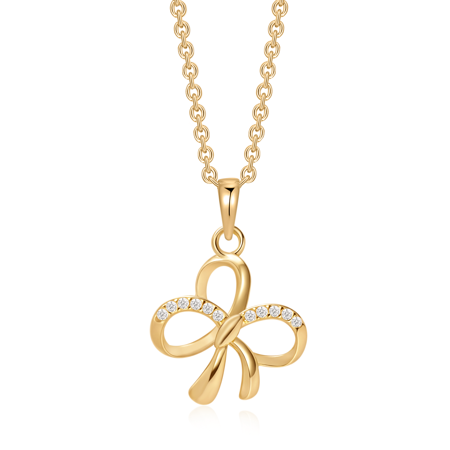 Smuk sølvforgyldt halskæde med et elegant sløjfedesign, prydet med syntetiske cubic zirconia, der tilføjer et glitrende og sofistikeret touch. Den rhodinerede sølvkæde sikrer et skinnende og holdbart look, som bevarer sin glans. Denne halskæde er perfekt til både hverdagsbrug og festlige lejligheder, og den tilfører et tidløst og feminint præg til ethvert outfit.