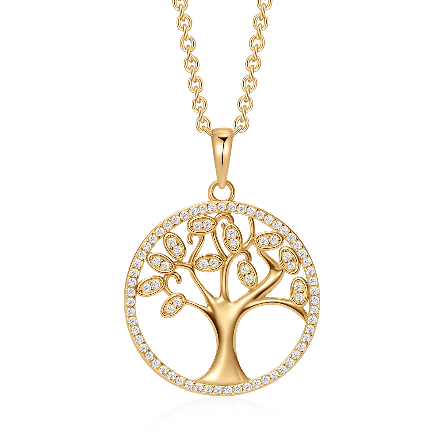 Smuk sølvforgyldt halskæde med et livets træ-vedhæng, prydet med syntetiske cubic zirconia. Livets træ symboliserer vækst, forbindelse og styrke, og de funklende cubic zirconia tilføjer et elegant og tidløst touch. Denne halskæde er perfekt til både hverdagsbrug og specielle anledninger, og den giver et sofistikeret udtryk, samtidig med at den bevarer sin meningsfulde symbolik.