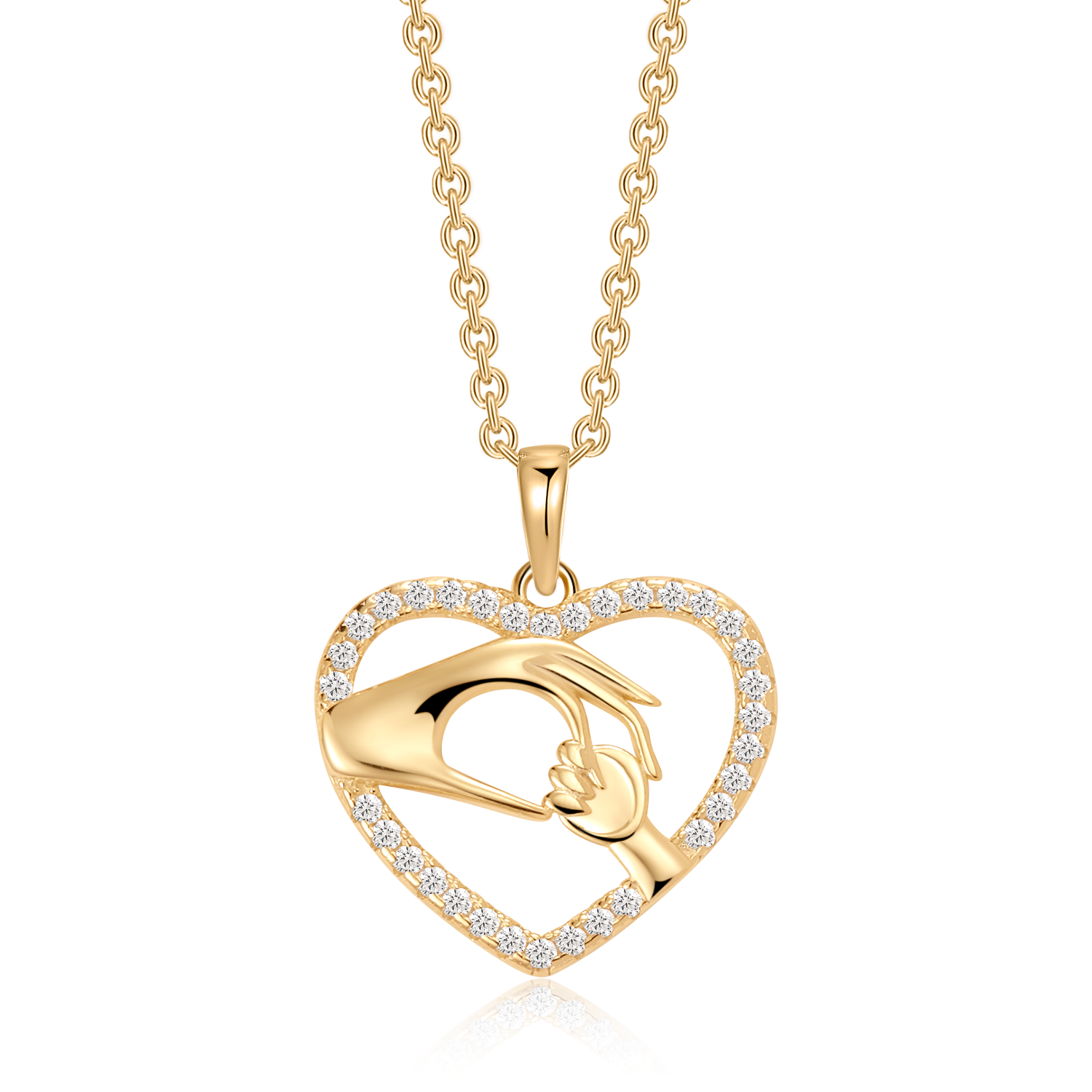 Elegant sølvforgyldt halskæde med et vedhæng, der forestiller hjerter og hænder som symbol på kærligheden mellem mor og barn, prydet med syntetiske cubic zirconia. Med sin tidløse "Mor og barn"-symbolik og den rhodinerede sølvkæde, der sikrer et skinnende og holdbart udseende, er denne halskæde et smukt valg til både hverdag og særlige anledninger.