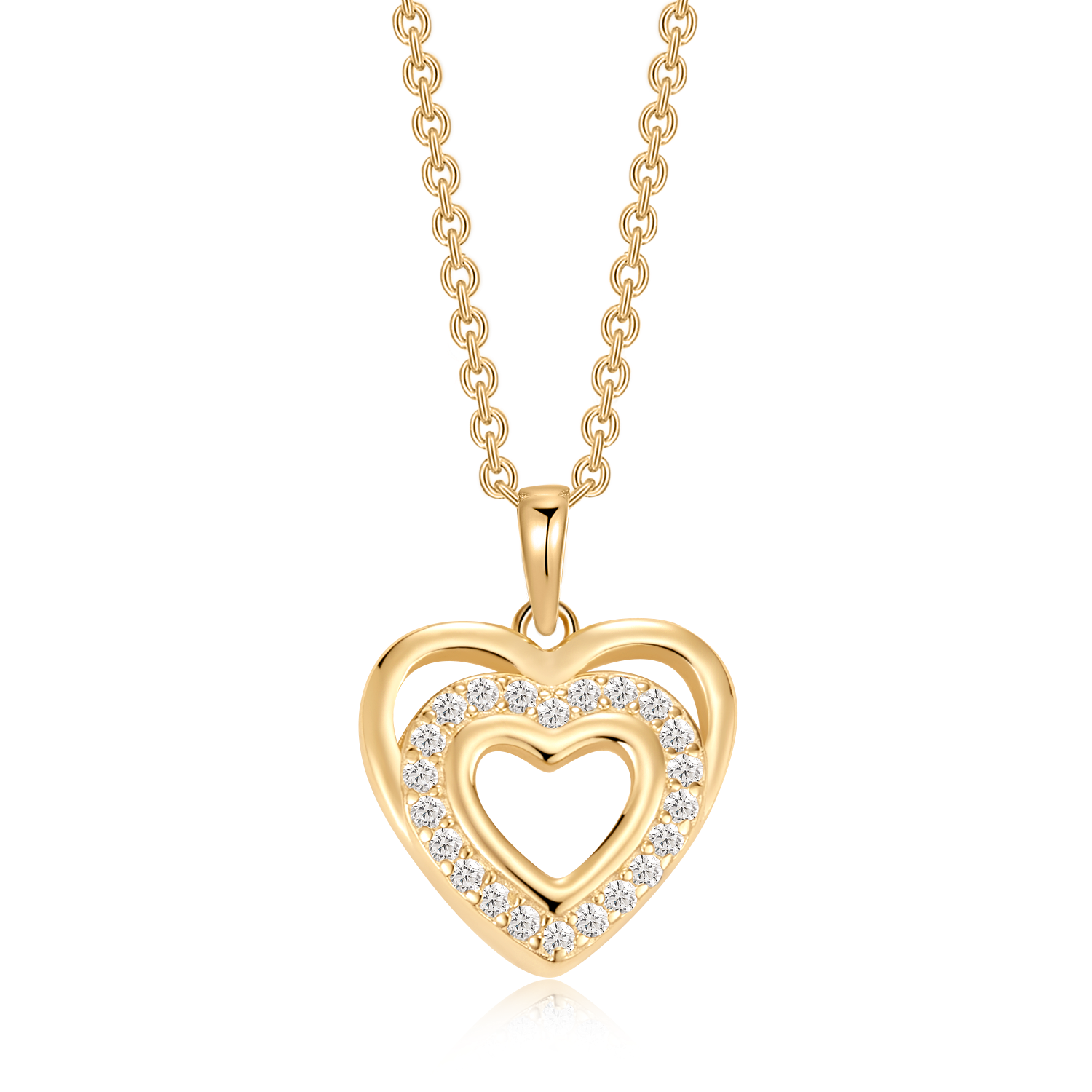 Denne elegante sølvforgyldte halskæde er designet med tre smukke hjerter, hver dekoreret med syntetiske cubic zirconia, som giver et skinnende og sofistikeret look. Kæden er lavet af rhodineret sølv, hvilket giver en ekstra holdbar finish. Halskæden har en justerbar længde, der gør den ideel til både hverdag og fest.
