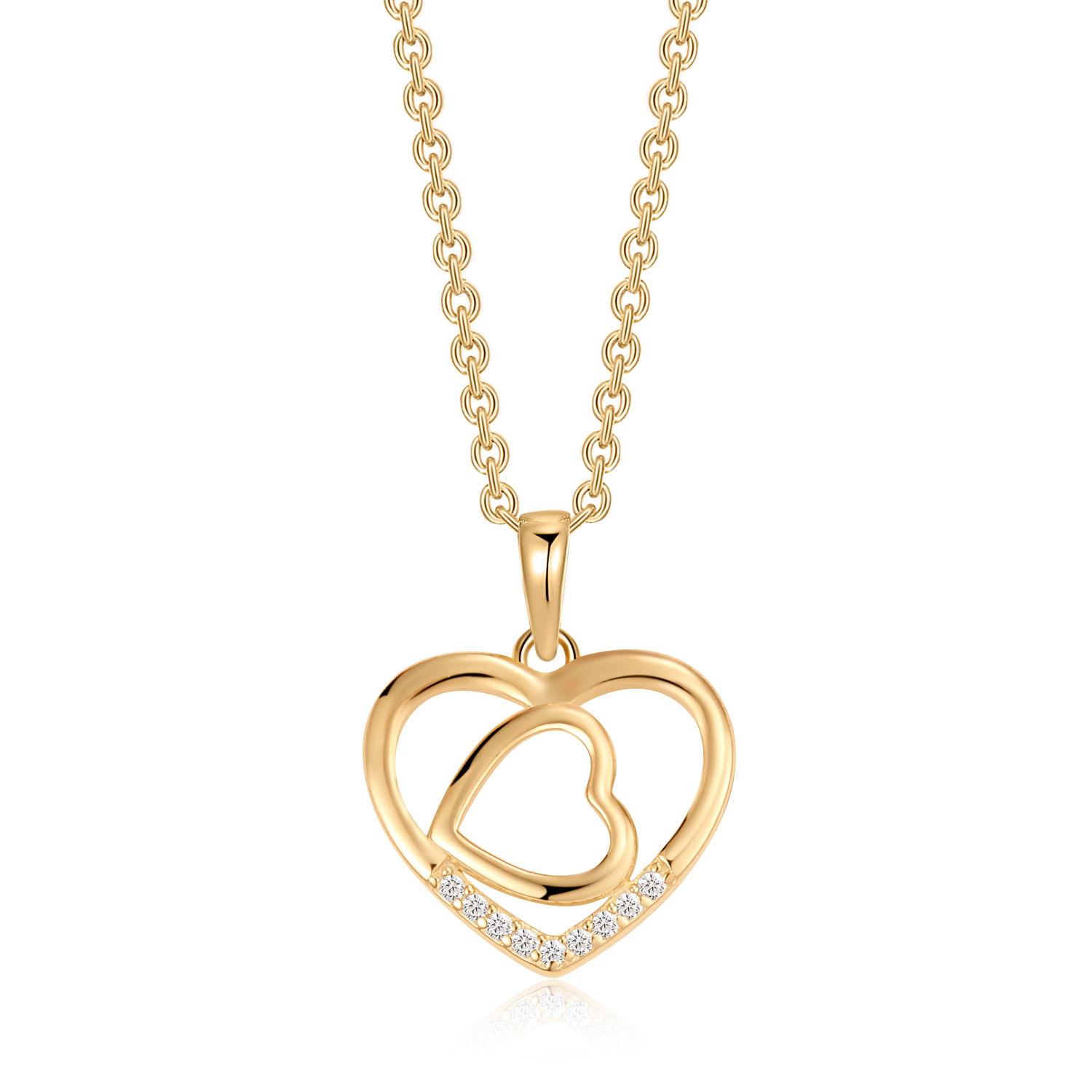 Denne sølvforgyldte halskæde er designet med et elegant dobbelt hjerte, smykket med syntetiske cubic zirconia, som tilføjer et sofistikeret og strålende udtryk. Halskæden er lavet af rhodineret sølv, der giver et ekstra lag af holdbarhed og skønhed. Den justerbare længde gør halskæden alsidig og ideel til både hverdagsbrug og festlige anledninger.