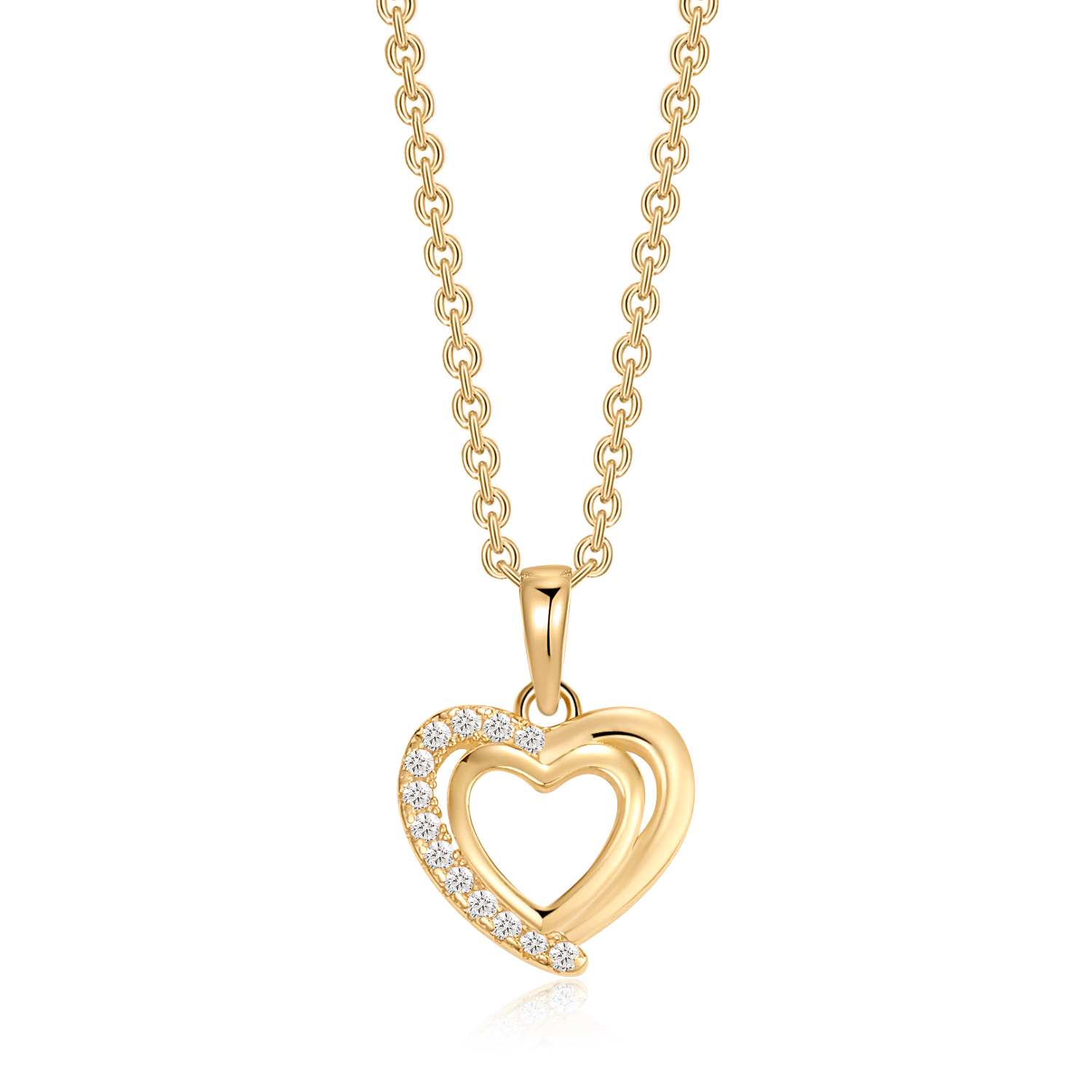 Denne smukke sølvforgyldte halskæde har et dobbelt hjerte-design, der er prydet med syntetiske cubic zirconia, hvilket giver et elegant og strålende udtryk. Halskæden er lavet af rhodineret sølv, hvilket giver den ekstra holdbarhed og glans. Den justerbare længde gør den ideel til at tilpasse sig forskellige stilarter og anledninger, fra hverdag til fest.