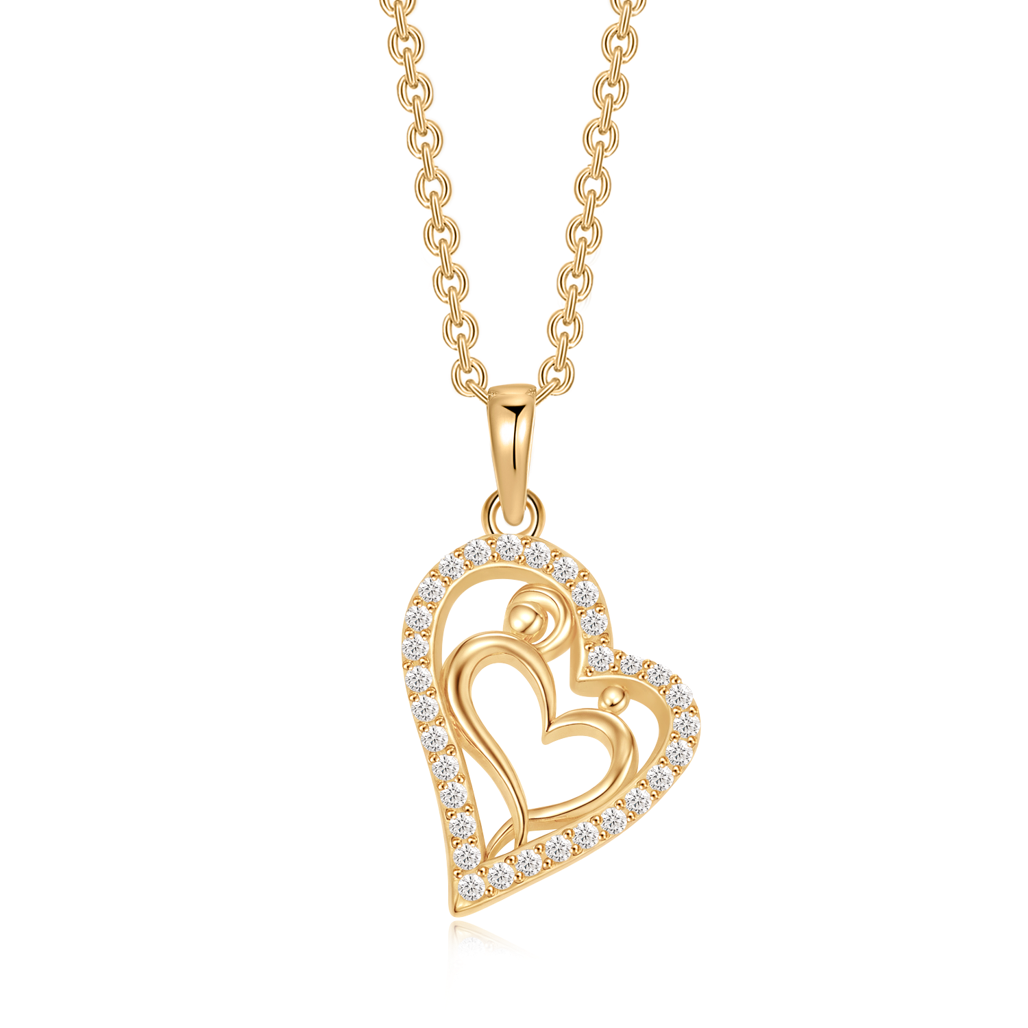 Smuk sølvforgyldt halskæde med et elegant skævt hjertevedhæng, der forestiller mor og barn – et symbol på kærlighed og stærke familiebånd. Vedhænget er udsmykket med funklende syntetiske cubic zirconia, som giver et eksklusivt og varmt udtryk. Den rhodinerede kæde sikrer ekstra glans og modstand mod anløbning. Et hjertevarmt smykke, perfekt som gave til en elsket mor.