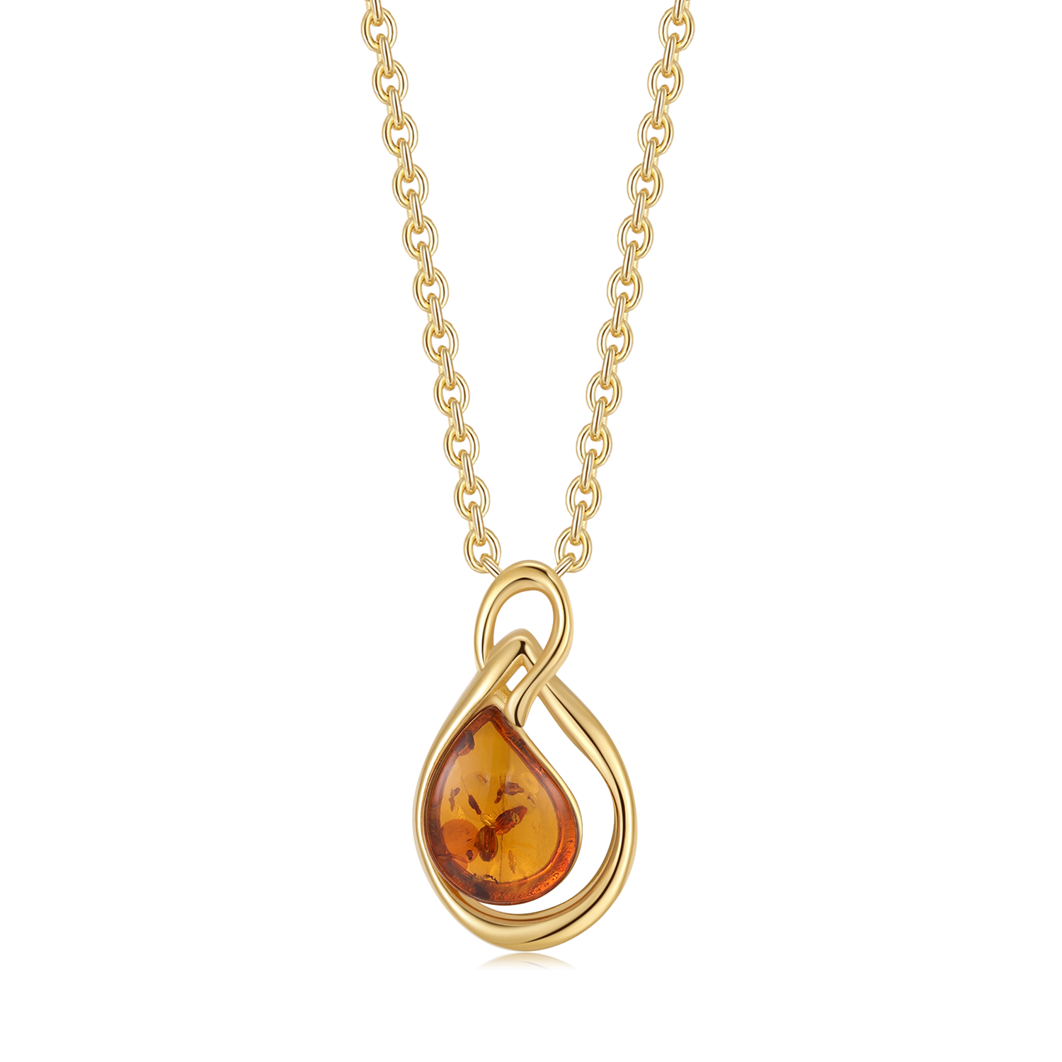 En elegant sølvforgyldt halskæde med et raffineret vedhæng, hvor en rund ravsten er indfattet i en indre ring og omgivet af en ydre ring, der skaber et harmonisk og moderne udtryk. Den varme glød fra ravet står smukt i kontrast til den gyldne forgyldning, hvilket giver et luksuriøst præg. Et tidløst smykke, der passer perfekt til både hverdag og fest.