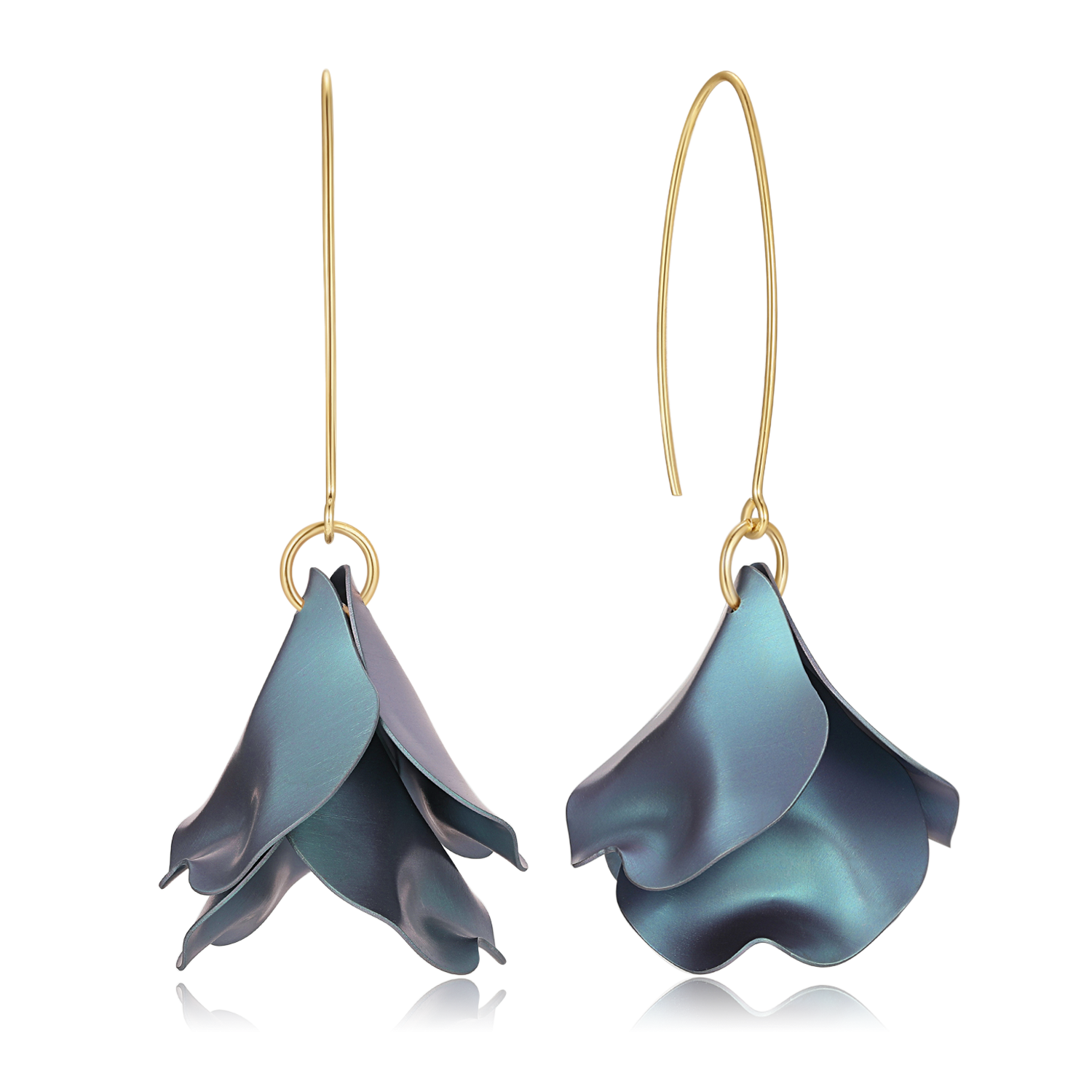 Disse smukke sølvforgyldte ørehængere kombinerer elegance og moderne stil. Øreringene er formet som fine blomster og dekoreret med blå jeans titanium, der tilfører et unikt farvespil og et eksklusivt udtryk. Den praktiske krog gør dem nemme at bære, og den lange, elegante form giver et feminint og iøjnefaldende look – perfekt til både hverdagsbrug og særlige lejligheder.