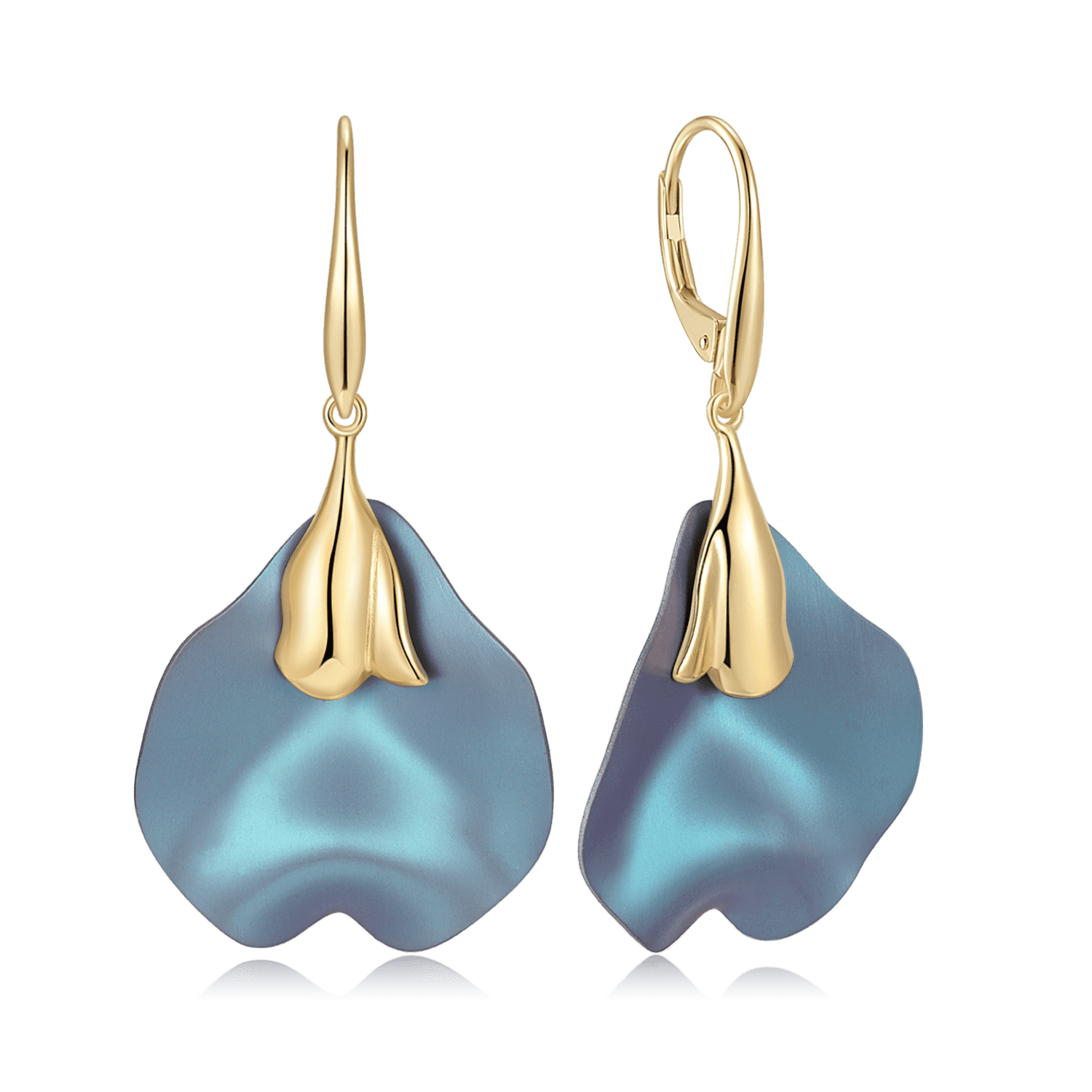 These elegant silver-plated earrings exude classic beauty with a modern twist. The piece is shaped like a delicate flower and adorned with blue jeans titanium, which gives it a unique play of colors and a sophisticated look. The German clasp ensures comfort and reliability during use, while the elegant design makes the earrings perfect for both everyday and festive occasions.