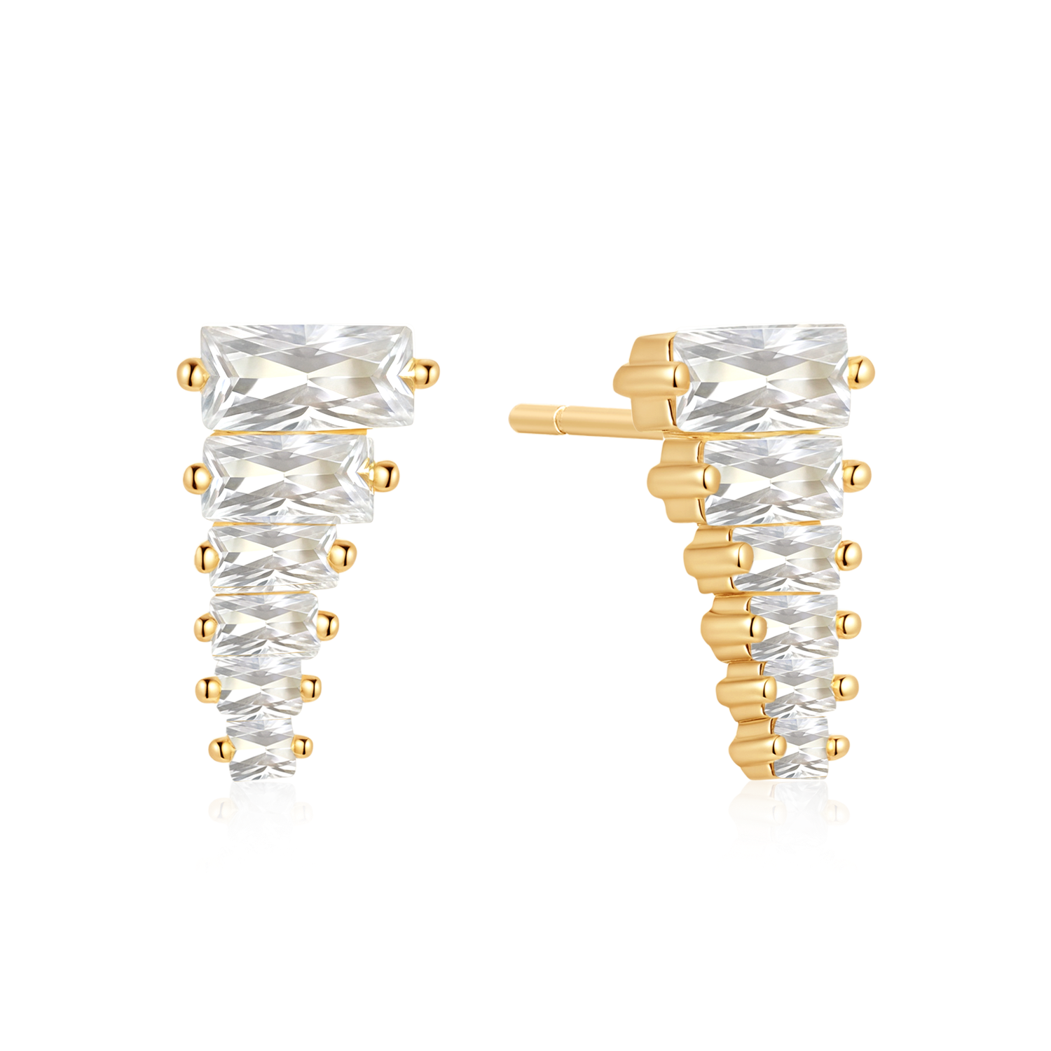 Disse moderne sølvforgyldte ørestikker har et stilrent og elegant design formet som en aflang trekant. Ørestikkerne er udsmykket med seks syntetiske cubic zirconia i forskellige størrelser, som giver et smukt spil af lys og glans. Den forgyldte overflade tilføjer varme og eksklusivitet, hvilket gør disse øreringe perfekte til både hverdagsbrug og særlige anledninger.