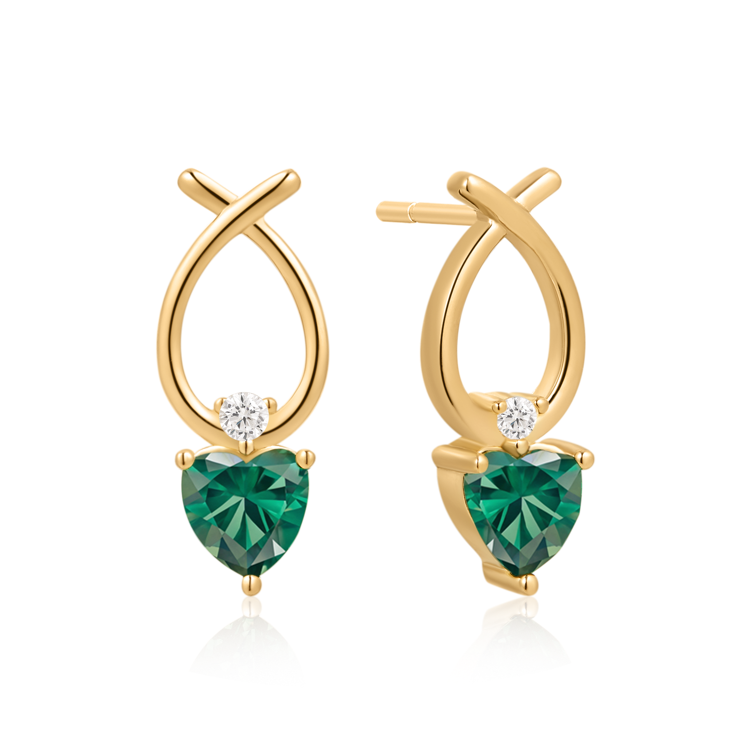 Disse elegante sølvforgyldte ørestikker har et stilfuldt design med en flettet oval form, der udstråler tidløs skønhed. I midten funkler en syntetisk smaragd, som fremhæves af en klar syntetisk cubic zirconia, der tilføjer ekstra glans. Den varme forgyldte overflade giver et luksuriøst præg, og kombinationen af grønne og klare sten skaber et harmonisk og eksklusivt udtryk.