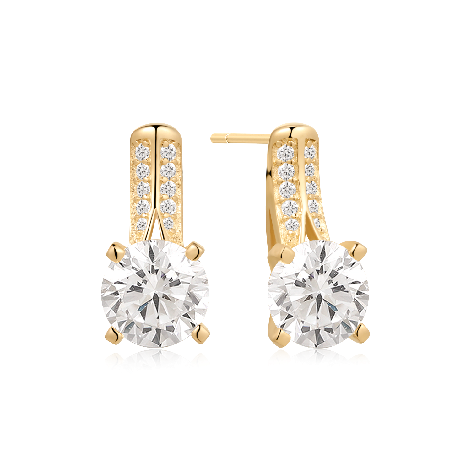 Disse klassiske sølvforgyldte ørestikker udstråler enkel elegance og tidløs skønhed. Designet fremhæver en funklende syntetisk cubic zirconia, der holdes sikkert på plads af fire grabber, som lader lyset reflektere smukt i stenen. Den forgyldte overflade giver et varmt og eksklusivt udtryk, hvilket gør ørestikkerne perfekte til både daglig brug og festlige lejligheder.