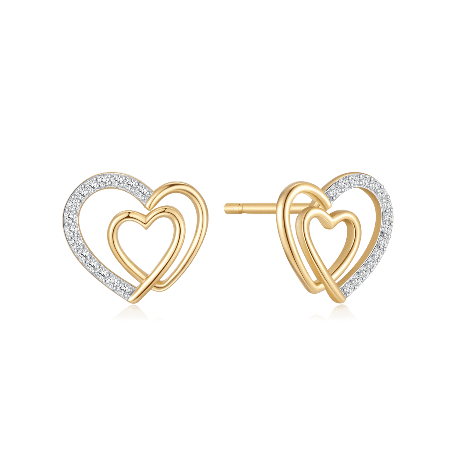 Disse sølvforgyldte ørestikker med dobbelt hjerte-design udstråler romantik og elegance. Øreringene er smukt udsmykket med funklende syntetiske cubic zirconia-sten, der giver et eksklusivt og glitrende udtryk. Den varme guldfarve og det fine design gør dem perfekte til både hverdag og festlige lejligheder, hvor de tilfører et strejf af tidløs charme og feminin finesse.