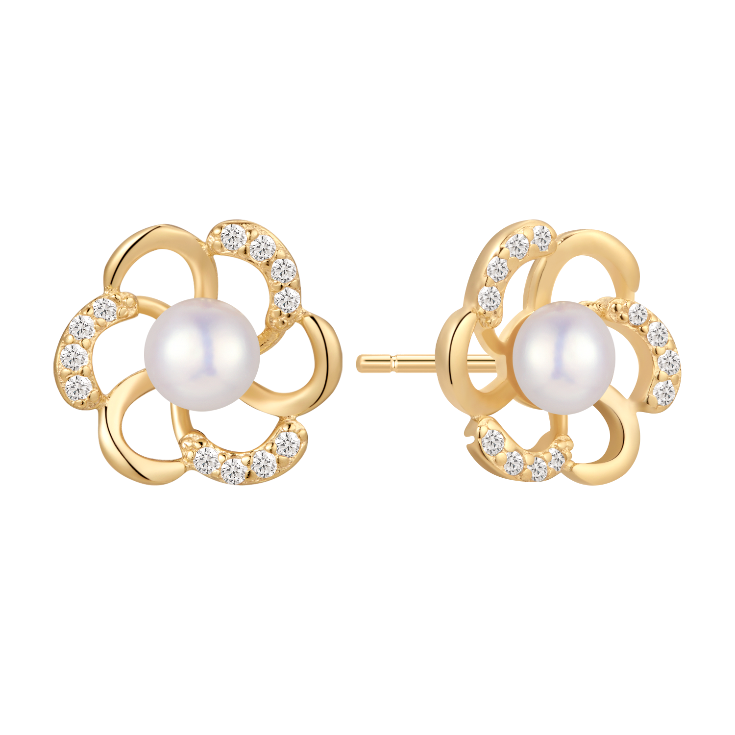 Elegante sølvforgyldte ørestikker formet som delikate blomster, der udstråler feminin skønhed og klassisk elegance. Øreringene er smukt dekoreret med funklende syntetiske cubic zirconia-sten og en glansfuld ferskvandsperle i midten. Kombinationen af den varme guldoverflade og de skinnende detaljer gør dem perfekte til både hverdagsbrug og festlige lejligheder.