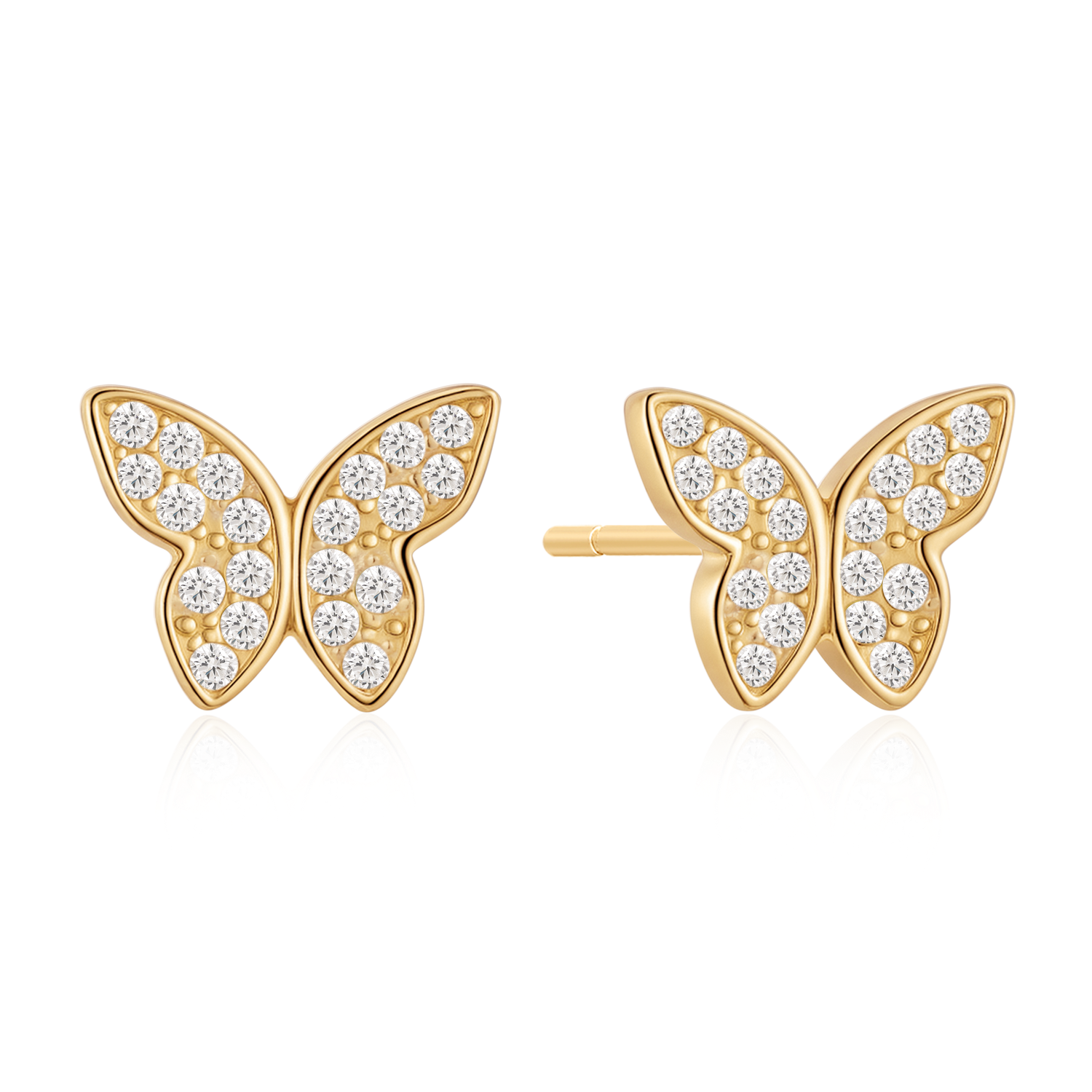 Disse sølvforgyldte ørestikker har et elegant sommerfugledesign udsmykket med funklende syntetiske cubic zirconia sten. Den gyldne overflade giver et varmt og eksklusivt udtryk, mens stenene tilfører smykket et smukt glimt. Perfekte til både hverdag og fest, hvor du ønsker et feminint og stilfuldt look med et strejf af luksus og lethed.