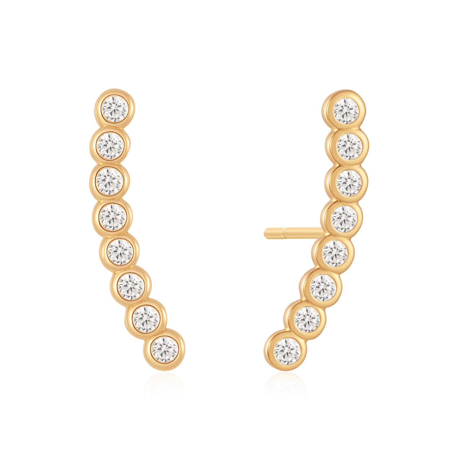 Disse elegante sølvforgyldte ørestikker har et stilrent design i en blød bue, prydet med otte funklende syntetiske cubic zirconia sten. Den gyldne overflade tilfører varme og luksus, mens stenene giver et smukt og feminint glimt. Et moderne og tidløst smykke, der passer perfekt til både hverdagsbrug og festlige lejligheder, hvor du ønsker et elegant udtryk.