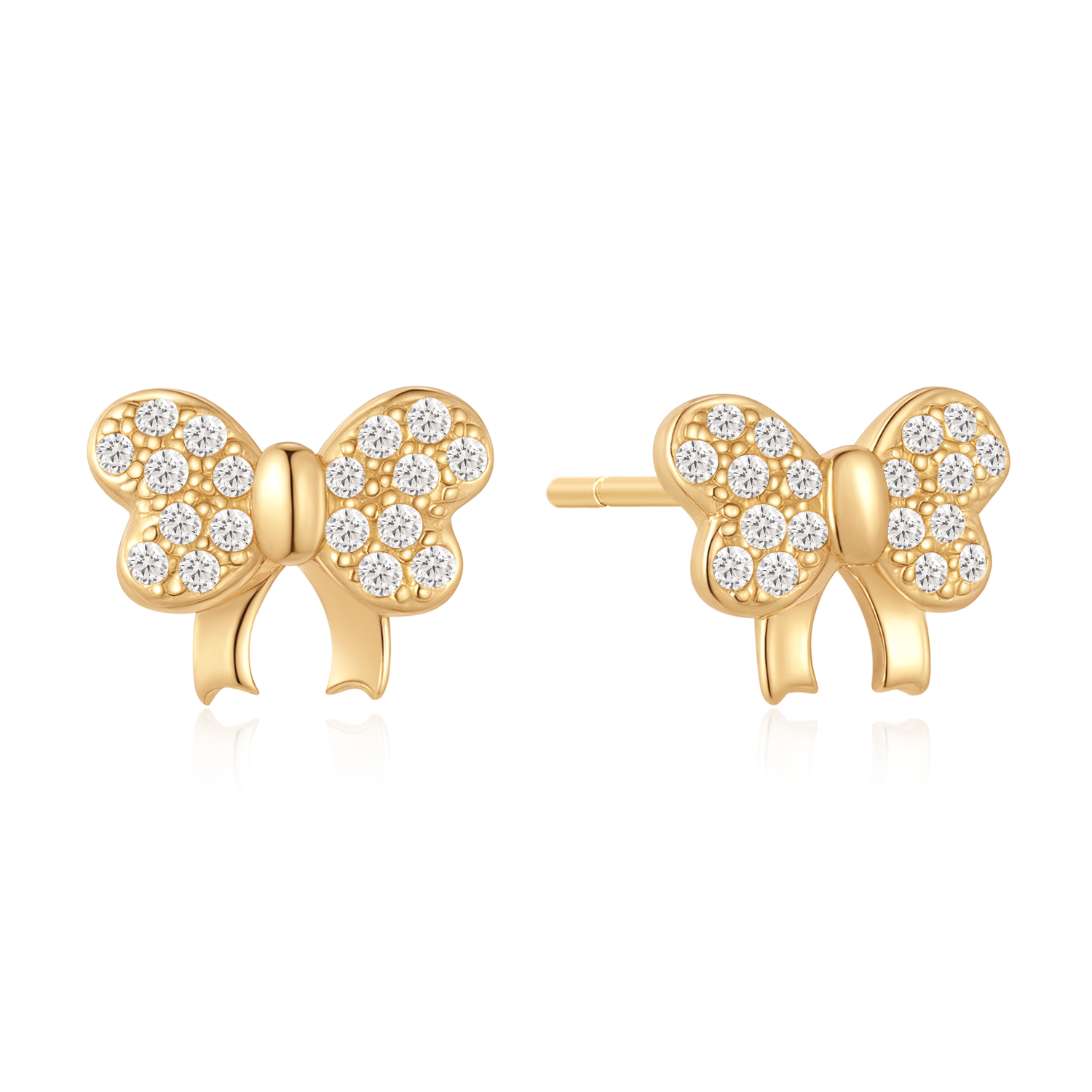 Disse elegante sølvforgyldte ørestikker er designet som delikate sløjfer og dekoreret med funklende syntetiske cubic zirconia sten. Den gyldne overflade giver et varmt og luksuriøst udtryk, mens det feminine design tilfører et strejf af elegance til ethvert outfit. Perfekte til både hverdag og festlige lejligheder, hvor de fremhæver din stil med subtil glamour.