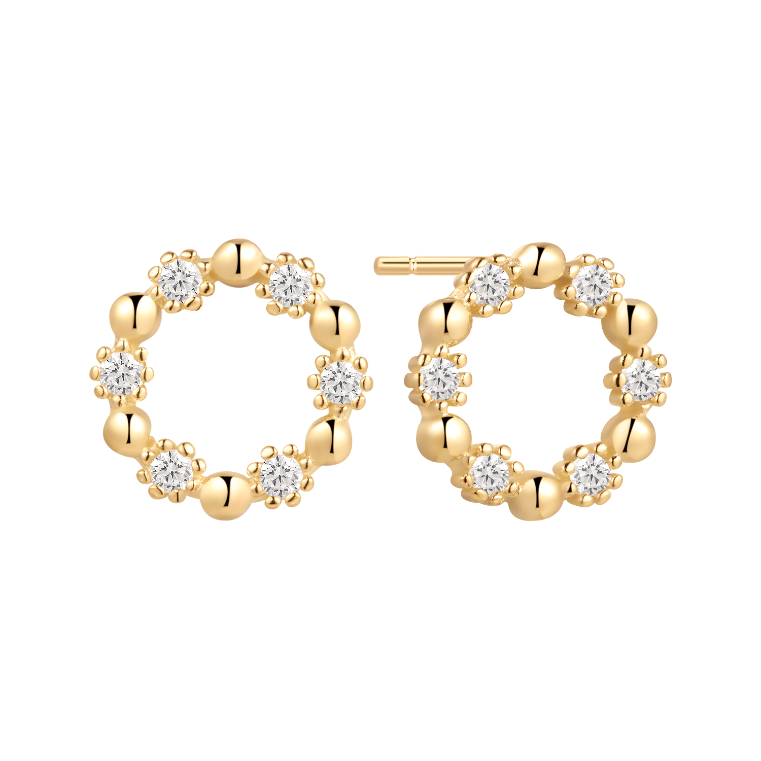 Disse elegante sølvforgyldte ørestikker er formet som klassiske cirkler og smukt indfattet med funklende syntetiske cubic zirconia sten rundt om kanten. Den gyldne overflade giver et varmt og luksuriøst udtryk, mens det enkle design gør dem velegnede til både hverdag og fest. Et tidløst smykke, der tilføjer et strejf af glans og raffinement til enhver stil.