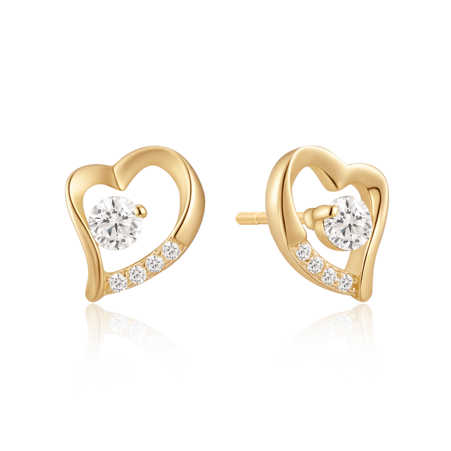 Disse smukke sølvforgyldte ørestikker er formet som skæve hjerter og udsmykket med funklende syntetiske cubic zirconia sten, der giver et elegant og glitrende udtryk. Den varme forgyldte overflade fremhæver stenens skønhed og tilfører et strejf af luksus. Øreringene kombinerer romantisk charme med moderne design og passer perfekt til både hverdag og festlige lejligheder.