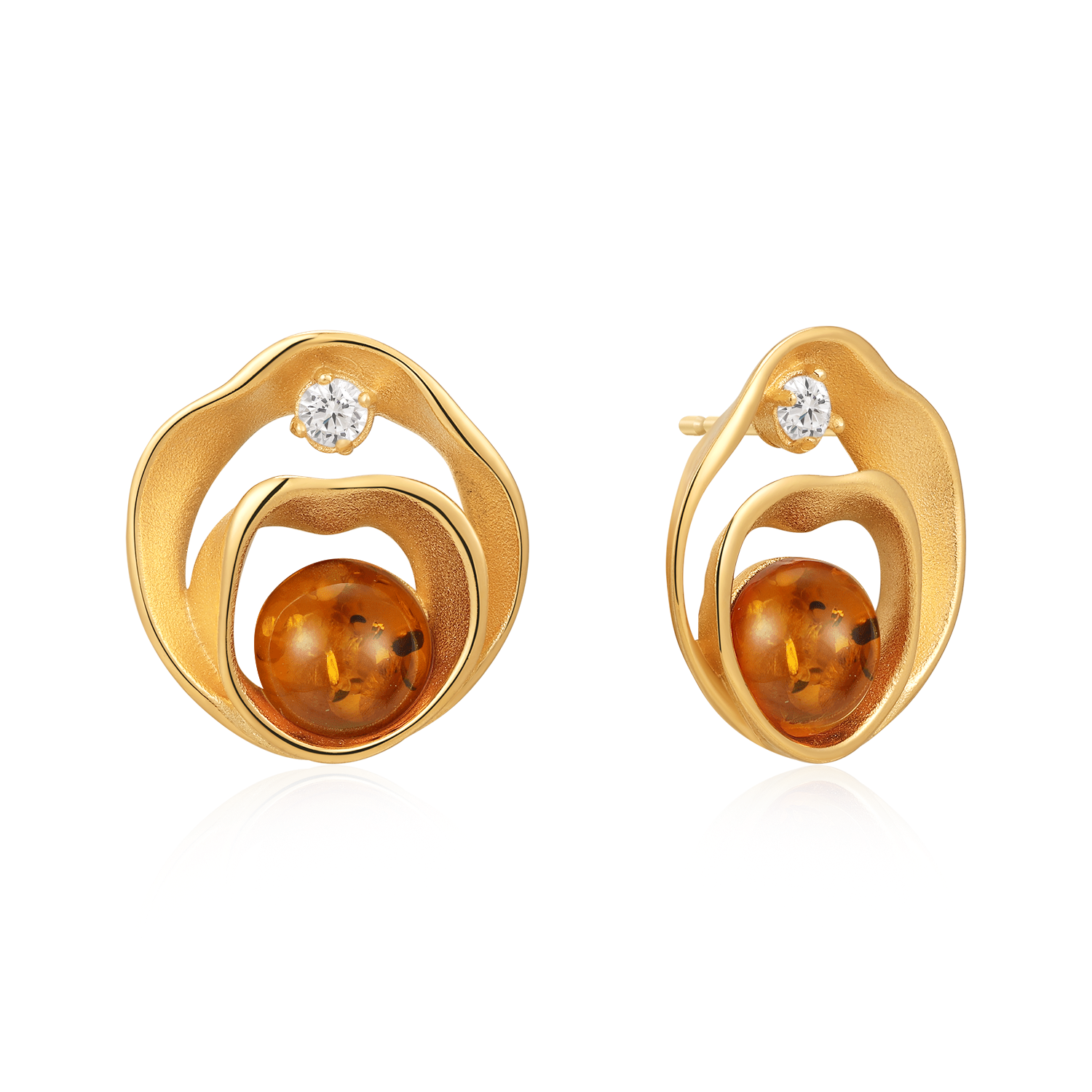 Disse sølvforgyldte ørestikker er et feminint og elegant valg, inspireret af naturens skønhed. Ørestikkerne er formet som blomster og kombinerer varm rav med funklende syntetiske cubic zirconia-sten, der giver et smukt spil mellem natur og glans. Fremstillet i sterlingsølv belagt med guld for ekstra glans og holdbarhed. Perfekte til både hverdag og festlige lejligheder med et eksklusivt udtryk.