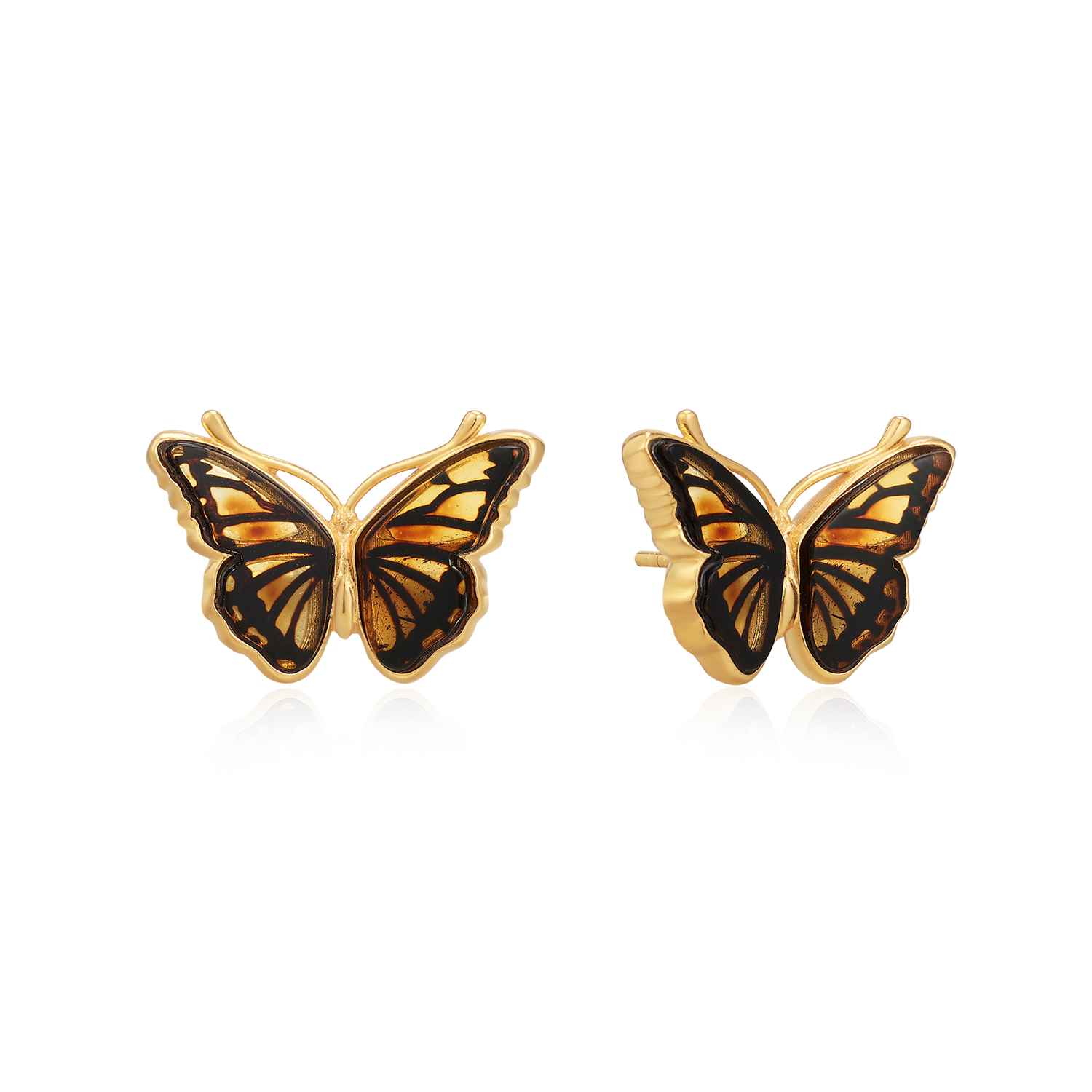 Disse sølvforgyldte ørestikker er formet som elegante sorte sommerfugle og udstråler både ynde og karakter. Fremstillet i sterlingsølv belagt med guld, kombinerer de et moderne design med klassisk charme. I midten prydes sommerfuglen af et varmt stykke rav, der tilfører et naturligt og unikt udtryk. Perfekte til både hverdag og fest, hvor de giver et smukt og feminint touch.