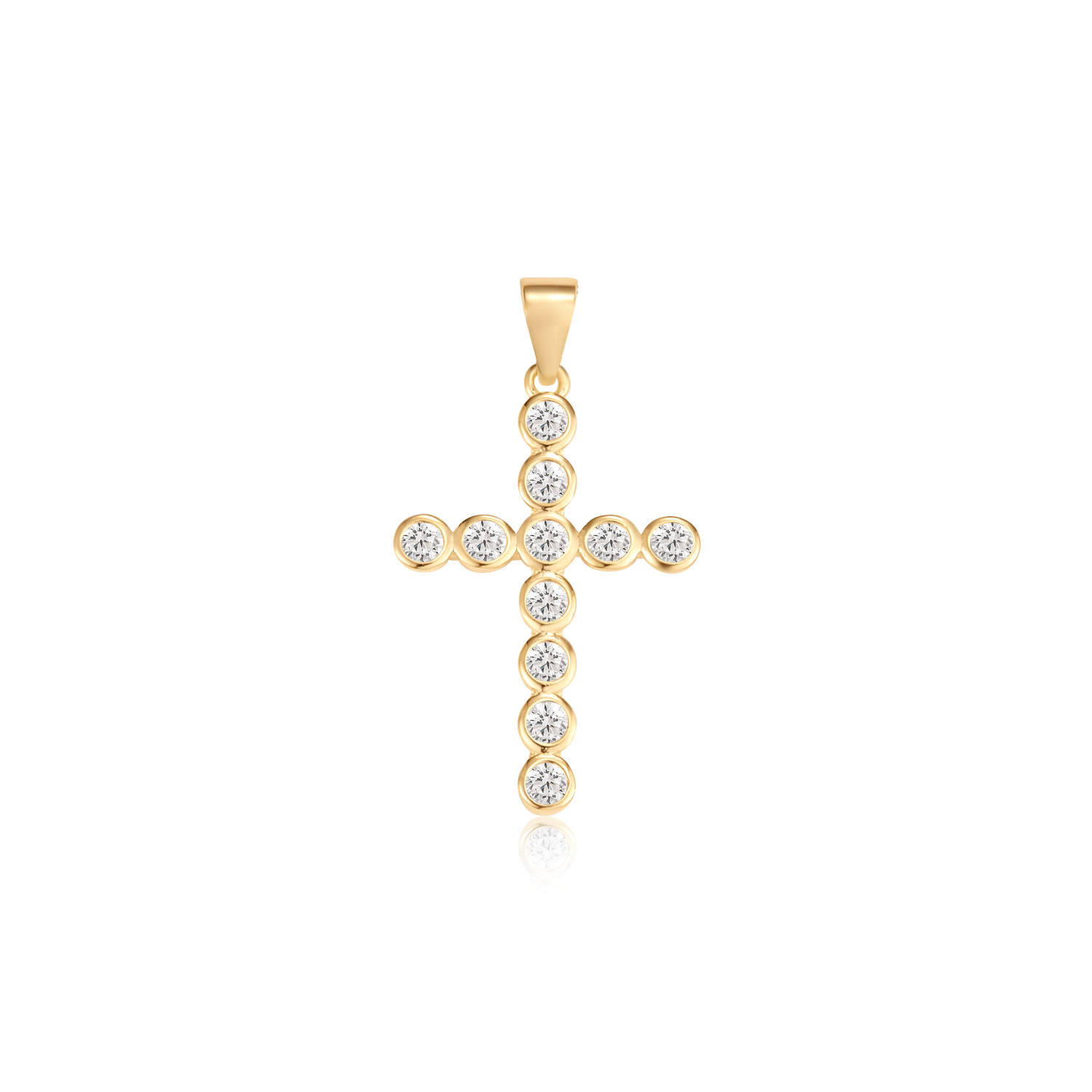 Dette smukke sølvforgyldte korsvedhæng er udsmykket med funklende syntetiske cubic zirconia, der giver et elegant og luksuriøst udtryk. Den gyldne overflade fremhæver stenens glans og tilføjer et strejf af raffinement til enhver stil. Med sine mål på 20 x 15 mm har vedhænget en diskret, men iøjnefaldende størrelse. Et ideelt valg til både hverdag og særlige lejligheder, eller som en meningsfuld gave.