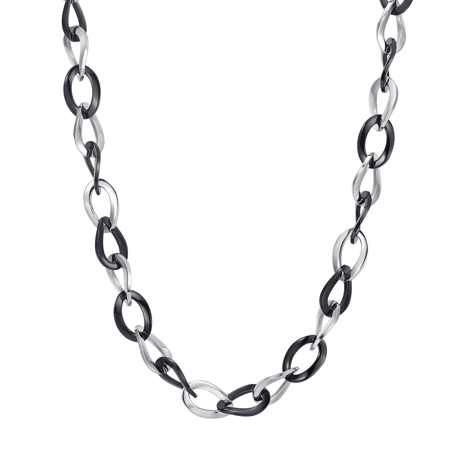 Denne moderne stålhalskæde har et iøjnefaldende design med ovale, drejede led, der skifter mellem sort og blankt stål. Kombinationen af farver giver et stilrent og maskulint udtryk, perfekt til både hverdagsbrug og mere formelle lejligheder. Halskæden er fremstillet i holdbart rustfrit stål og har en forlængerkæde, der sikrer en justerbar og behagelig pasform.