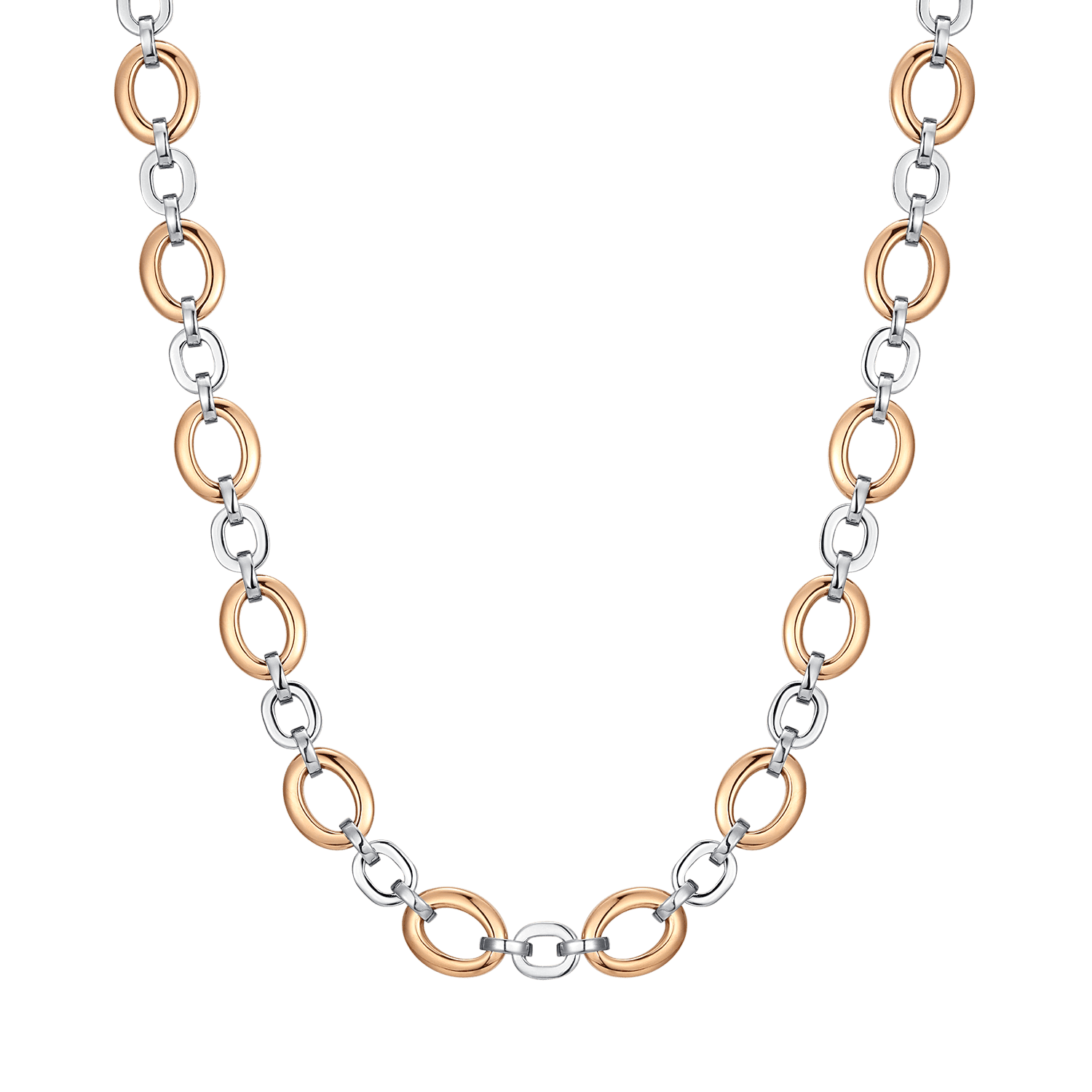 Denne stilfulde stålhalskæde præsenterer et unikt design med store ovale led i rosafarvet stål kombineret med mindre led i blankt stål. Kontrasten mellem farverne giver halskæden et moderne og elegant udtryk, der passer perfekt til både hverdag og fest. Fremstillet i slidstærkt rustfrit stål, der sikrer langvarig glans og holdbarhed. Den justerbare længde giver fleksibel pasform.